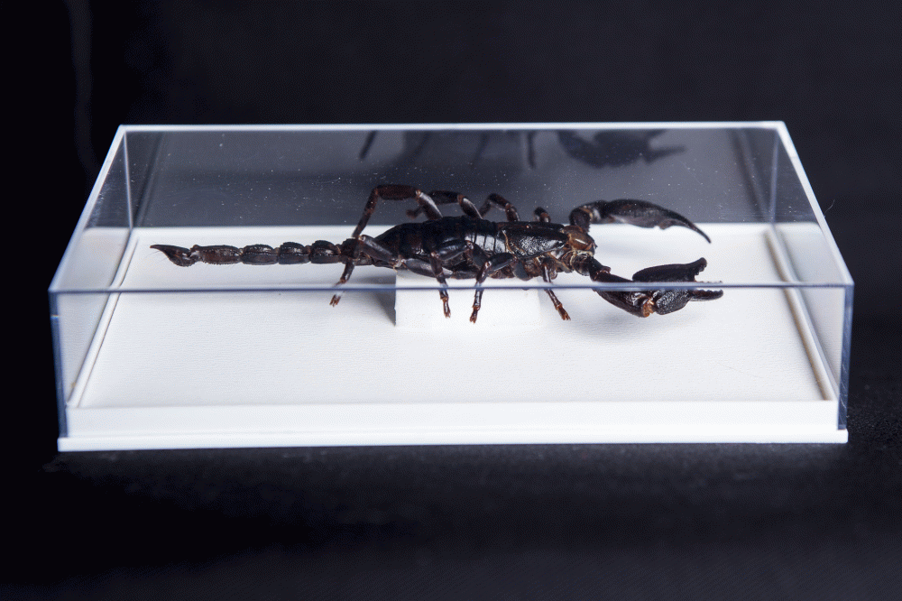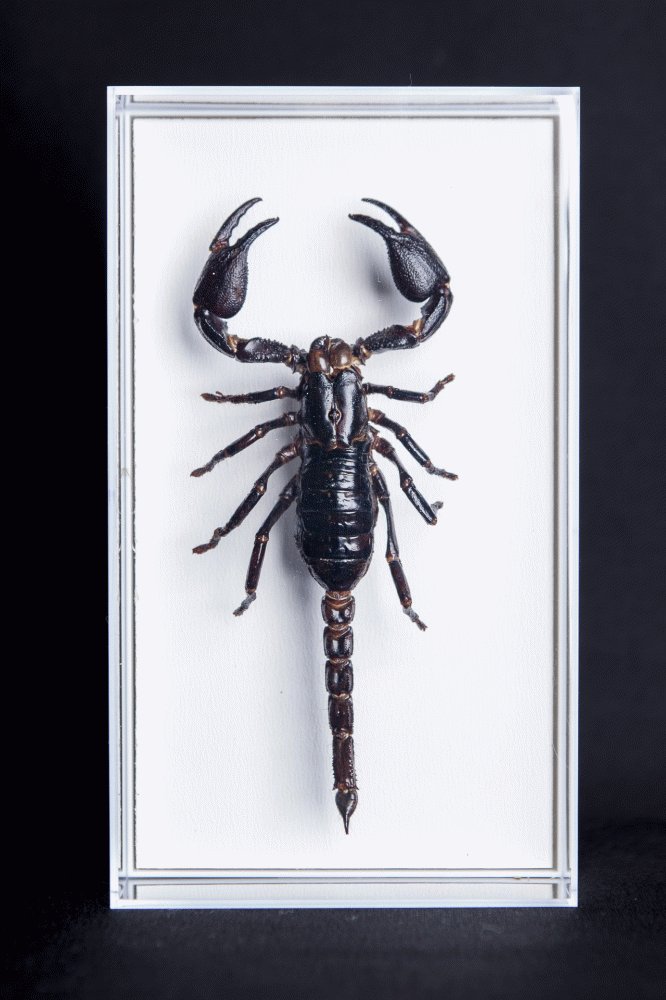 De opgezette schorpioenen die wij verkopen zijn verantwoord verzameld en op deskundige wijze geprepareerd. Ze kunnen naar wens met de staart omhoog of omlaag worden geprepareerd. In ons rariteiten kabinet is de grote verscheidenheid en diversiteit van opgezette schorpioenen te koop en te bewonderen. Wij leveren opgezette schorpioenen in speciaal bijpassende kunststof doosjes, met of zonder een zandbodem. Voor de grotere soorten hebben wij bovendien speciaal op maat gemaakte houten kistjes.