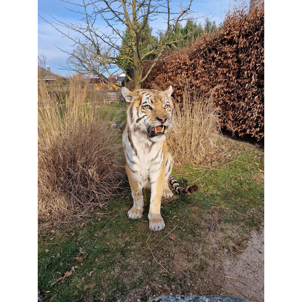 Bijzonderheden: Radja is geboren en overleden in een Dierentuin in Duitsland. Hij was de trots van het park en er werd met hem gefokt om een gezonde bloedlijn aan tijger reintegratie projecten te kunnen bieden. Helaas sloeg het noodlot toe en is Radja onverwacht overleden. De littekens op zijn poot vertellen het verhaal. Nu heeft hij een tweede leven gekregen met de uitstraling zoals je een opgezette tijger nog nooit hebt gezien. Een preparaat van wereld klasse.